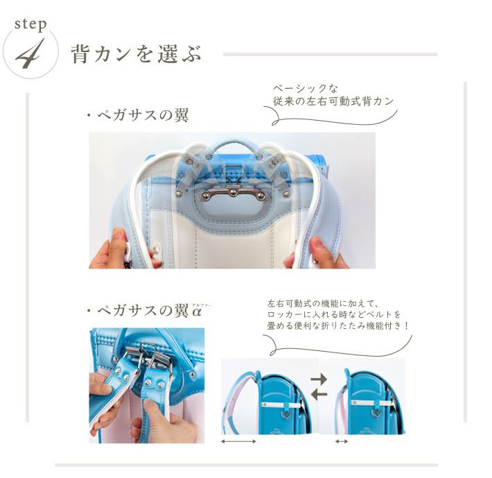 ※ ペガサスの翼の根本の金具は本体色に合わせた色、ペガサスの翼α(折りたたみ背カン)の根元の金具はシルバーになります。