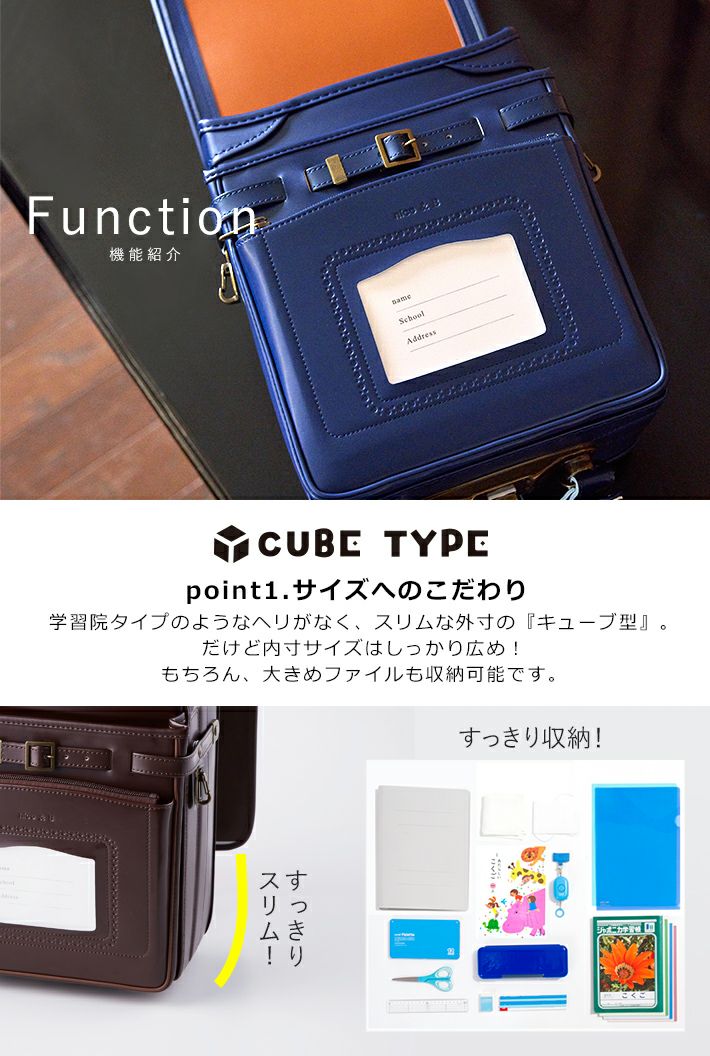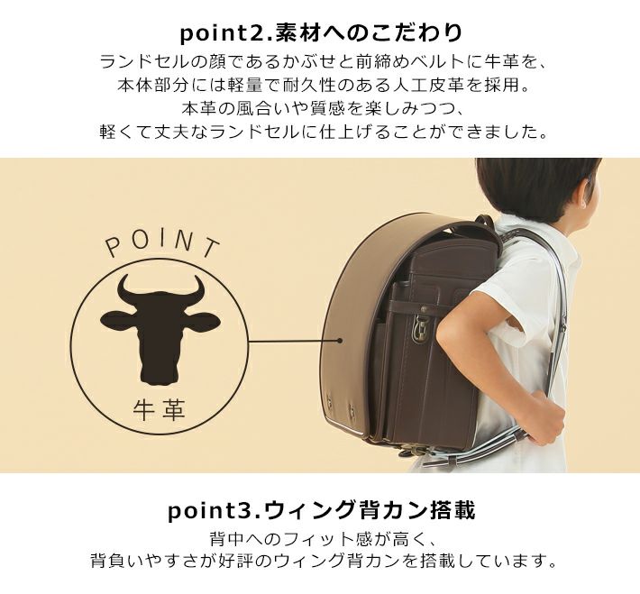 カブセとマチベルトに本革使用した、本格的なランドセル。